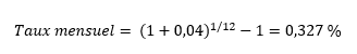 Le taux annuel est de 4 % et vous souhaitez connaître le taux mensuel.
