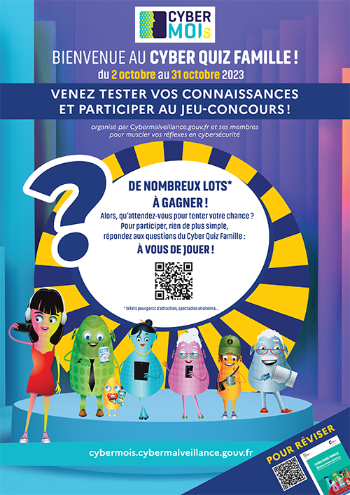 La version 2024 est disponible ! Vvous pouvez tester vos connaissances cyber grâce à la toute nouvelle édition du Cyber Quiz Famille. A la clé, de nombreux lots à gagner !