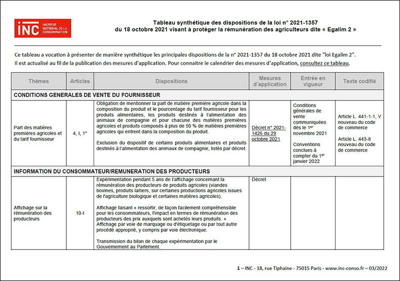 Elle a notamment eu pour effet un relèvement du seuil de revente à perte de 10 % et un encadrement des promotions de 34 % en valeur et 25 % en volume (pour en savoir plus, consultez le document de l’INC "Décryptage de la loi "Egalim""). Cette loi n’ayant pas permis le rééquilibrage des relations commerciales qui était l’objectif visé (voir l’article de l’INC "Loi "Egalim" : bilan un an après sa promulgation" de décembre 2019), le législateur a de nouveau travaillé sur la question de la défense du revenu des agriculteurs.
